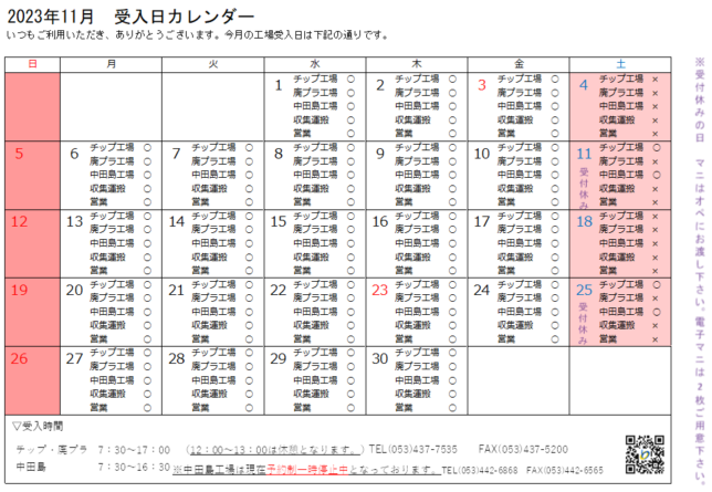 2023年11月営業日、受入日のお知らせ 2023年10月20日 いつもご利用いただきありがとうございます。2023年11月の営業日、工場受入れ日は カレンダーの通りとさせて頂きます。 受付がお休みの日に搬入される方は、お手数ですが マニフェストを工場のオペにお渡しください。 電子マニフェストで受渡確認票をお持ちの方は、 2枚オペにお渡しください。 宜しくお願い致します。