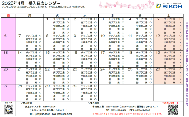 2025年4月営業日、受入日のお知らせ 2025年3月31日 いつもご利用いただきありがとうございます。2025年4月の営業日、工場受入れ日は カレンダーの通りとさせて頂きます。 中田島工場は予約制とさせて頂きます。 ↑こちらの予約用QRコードより事前予約お願い致します。 受付がお休みの日に搬入される方は、お手数ですが マニフェストを工場のオペにお渡しください。 電子マニフェストで受渡確認票をお持ちの方は、 2枚オペにお渡しください。 宜しくお願い致します。