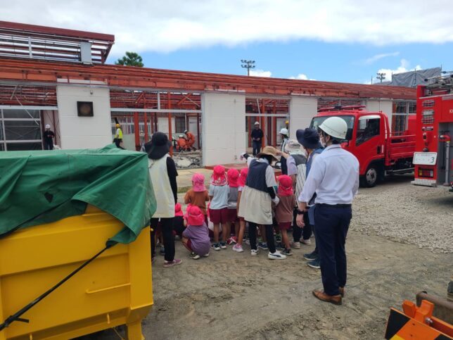 隣接する仮設園舎に通う園児たちも訓練を見学し、