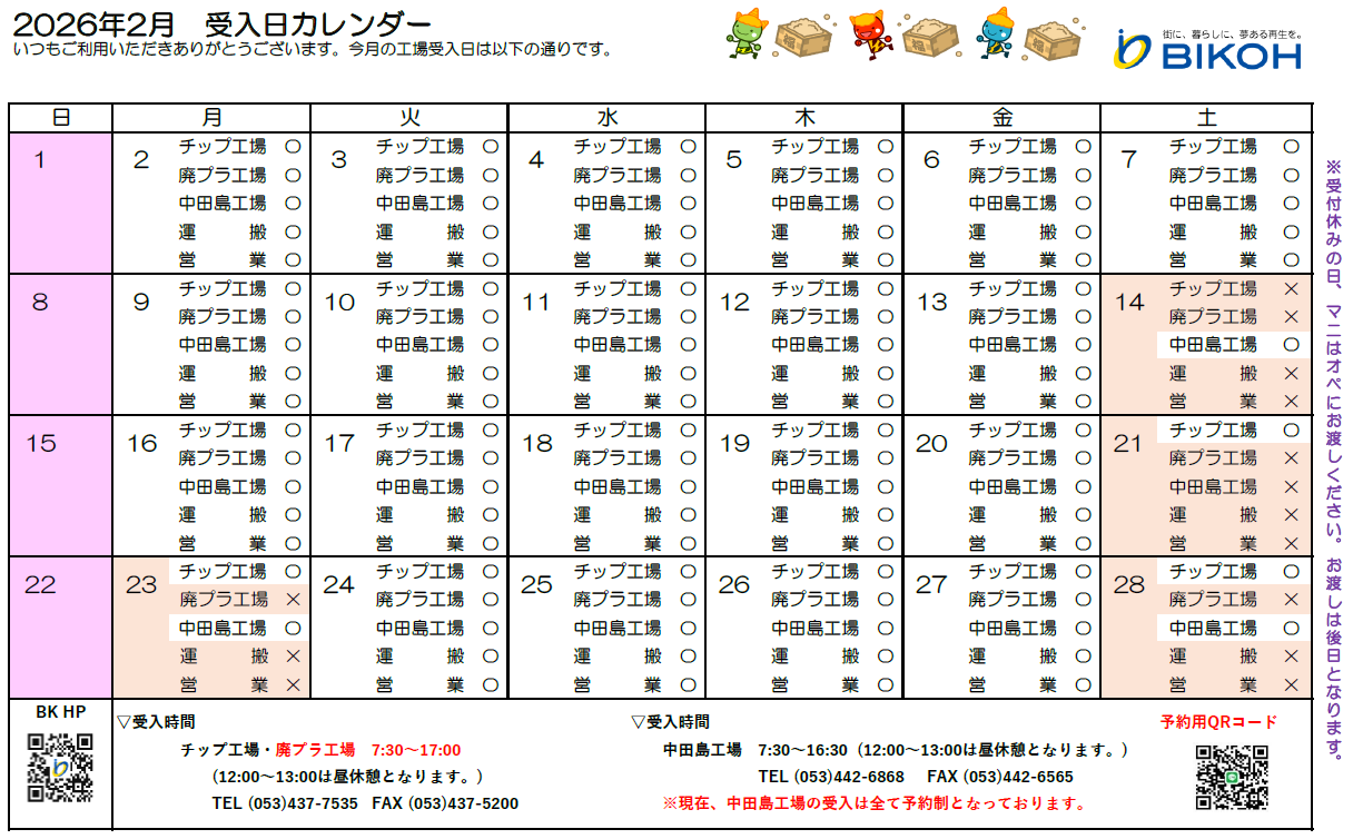 2026年2月営業日、受入日のお知らせ 2026年1月22日 いつもご利用いただきありがとうございます。2026年2月の営業日、工場受入れ日は カレンダーの通りとさせて頂きます。 中田島工場は予約制とさせて頂きます。 ↑こちらの予約用QRコードより事前予約お願い致します。 受付がお休みの日に搬入される方は、お手数ですが マニフェストを工場のオペにお渡しください。 電子マニフェストで受渡確認票をお持ちの方は、 2枚オペにお渡しください。 宜しくお願い致します。