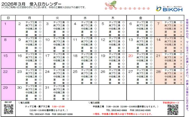 2026年3月営業日、受入日のお知らせ(修正) 2026年2月26日 いつもご利用いただきありがとうございます。2026年3月の営業日、工場受入れ日に変更がありました。 3月の土曜日は、中田島工場は搬入不可となります。 中田島工場は予約制とさせて頂きます。 ↑こちらの予約用QRコードより事前予約お願い致します。 受付がお休みの日に搬入される方は、お手数ですが マニフェストを工場のオペにお渡しください。 電子マニフェストで受渡確認票をお持ちの方は、 2枚オペにお渡しください。 宜しくお願い致します。