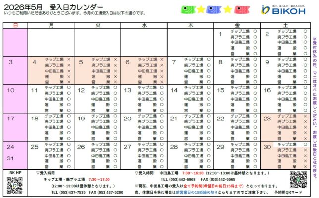 2026年5月営業日、受入日のお知らせ 2026年4月24日 いつもご利用いただきありがとうございます。2026年5月の営業日、工場受入れ日は カレンダーの通りとさせて頂きます。 中田島工場は予約制とさせて頂きます。 ↑こちらの予約用QRコードより事前予約お願い致します。 受付がお休みの日に搬入される方は、お手数ですが マニフェストを工場のオペにお渡しください。 電子マニフェストで受渡確認票をお持ちの方は、 2枚オペにお渡しください。 宜しくお願い致します。